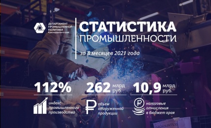 На Кубани промпроизводство в январе-августе 2021г. выросло на 12%